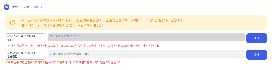 키워드 설정은 키워드를 입력한 후 *우측 '추가' 버튼* 또는 *엔터키*를 입력해주셔야 키워드가 설정됩니다.\
