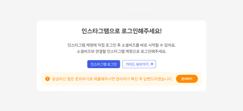 * 아래 안내 화면에서 \[인스타그램 로그인] 버튼을 클릭하시면 페이지 없이 소셜비즈를 연동할 수 있어요.