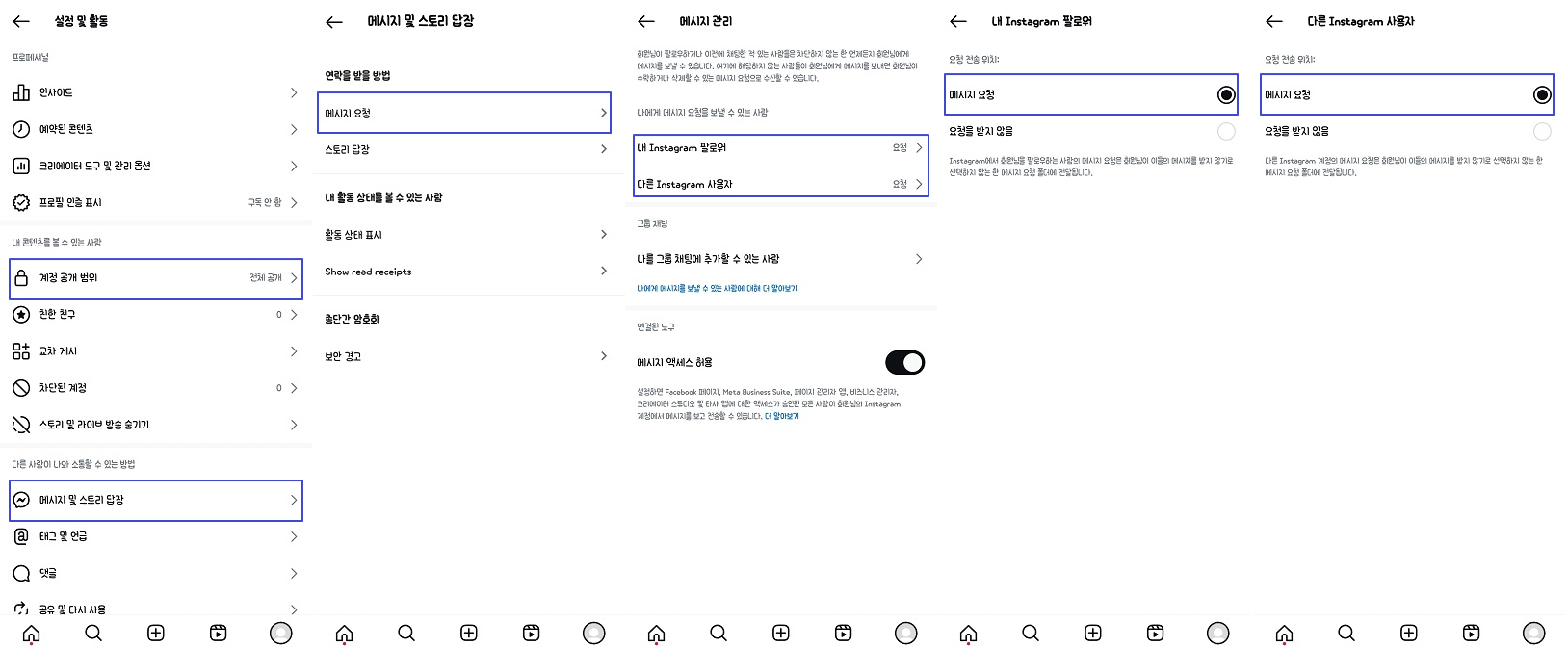 메시지를 수신받는 고객님의 계정 공개 범위가 비공개 상태이거나, 메시지 요청을 받지 않음 상태일 경우 DM이 발송되지 않을 수 있습니다. 인스타그램 앱 실행 후 우측 하단 프로필 사진을 클릭한 다음 우측 상단 3개의 바☰(햄버거 버튼)을 클릭 후 아래의 이미지처럼 메뉴 설정 확인 필요합니다. 메시지 수신이 되지 않는 사용자 분들의 계정 공개 범위 설정과 메시지 및 스토리 답장 메시지 관리의 상태 확인을 해보시길 권장 합니다.