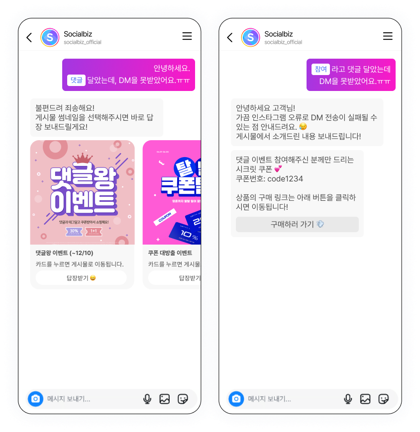 게시물의 본문에서 댓글을 남겼지만 메시지를 받지 못한 경우는 같은 키워드로 DM을 직접 보내달라고 안내해주세요.