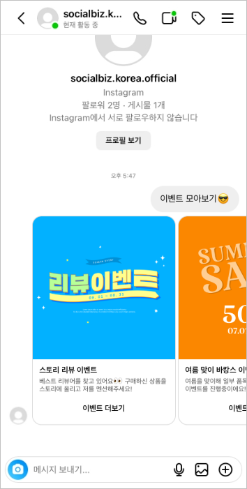 쇼핑몰의 이벤트를 모아볼 수 있는 캐러셀 메시지를 전송해보세요.\