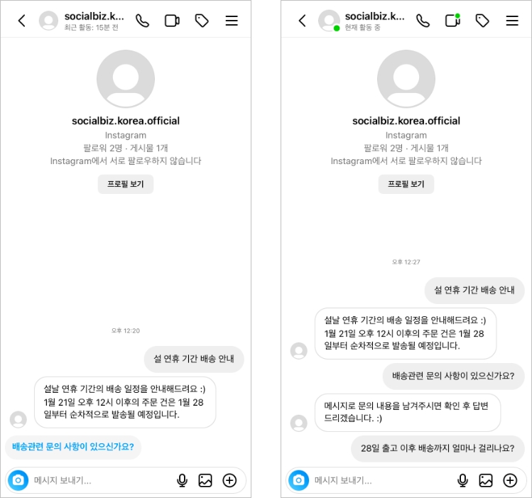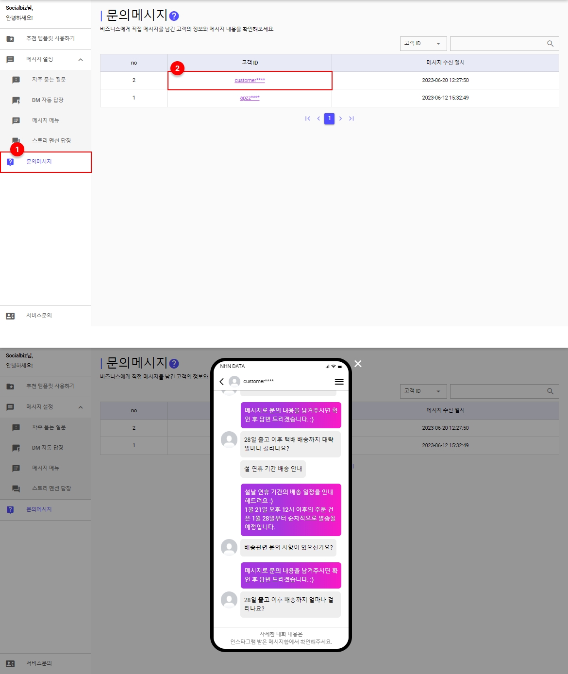 고객이 남긴 메시지는 소셜비즈 [대화요청] 메뉴에서 확인할 수 있어요.