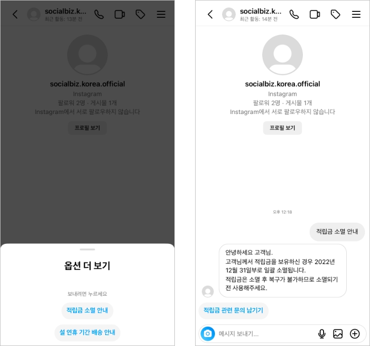 고객에게 직접 메시지를 보내려면 인스타그램 앱 또는 Meta Business Suite 의 [받은 메시지함] 으로 이동해주세요.