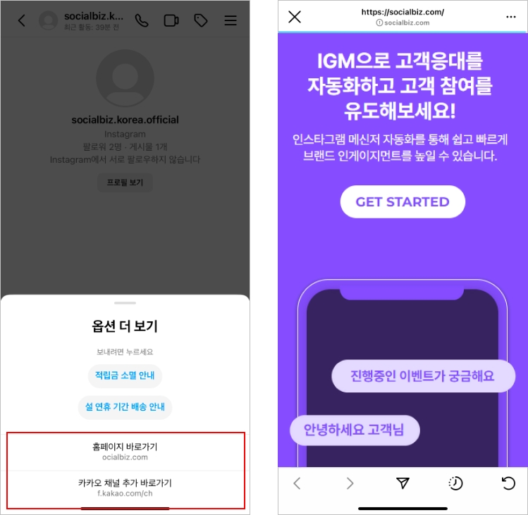 Tip💡 카카오톡 채널톡, 외부 오픈 플랫폼 (지그재그 등) 을 운영 중인 비즈니스는 연결 링크를 게시하고 인스타그램으로 유입된 고객을 다른 플랫폼으로 연결할 수 도 있습니다.