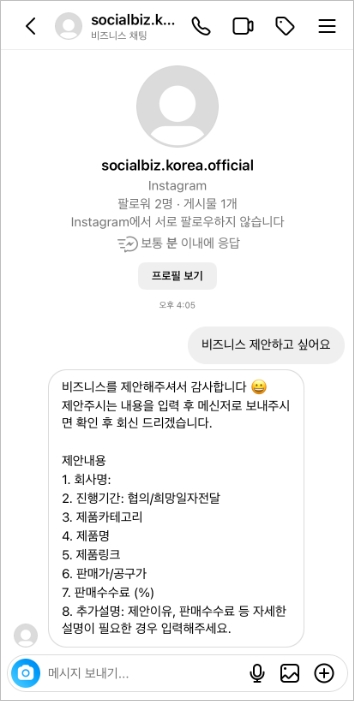 비즈니스 제안을 위한 양식이 없으신 경우 답장 유형 중 문의메시지(Inquiry)를 활용해보세요.