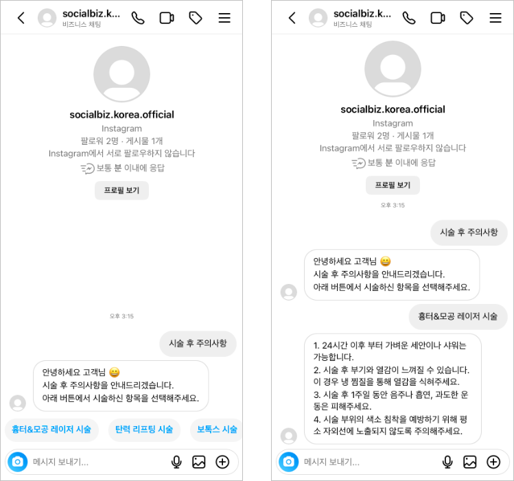 시술 이후 고객에게 직접 주의 사항에 대해 안내하지만, 추가 안내가 필요한 여러 상황에 대응하기 위해 메시지를 자동화하면 응대 리소스를 절감할 수 있어요.