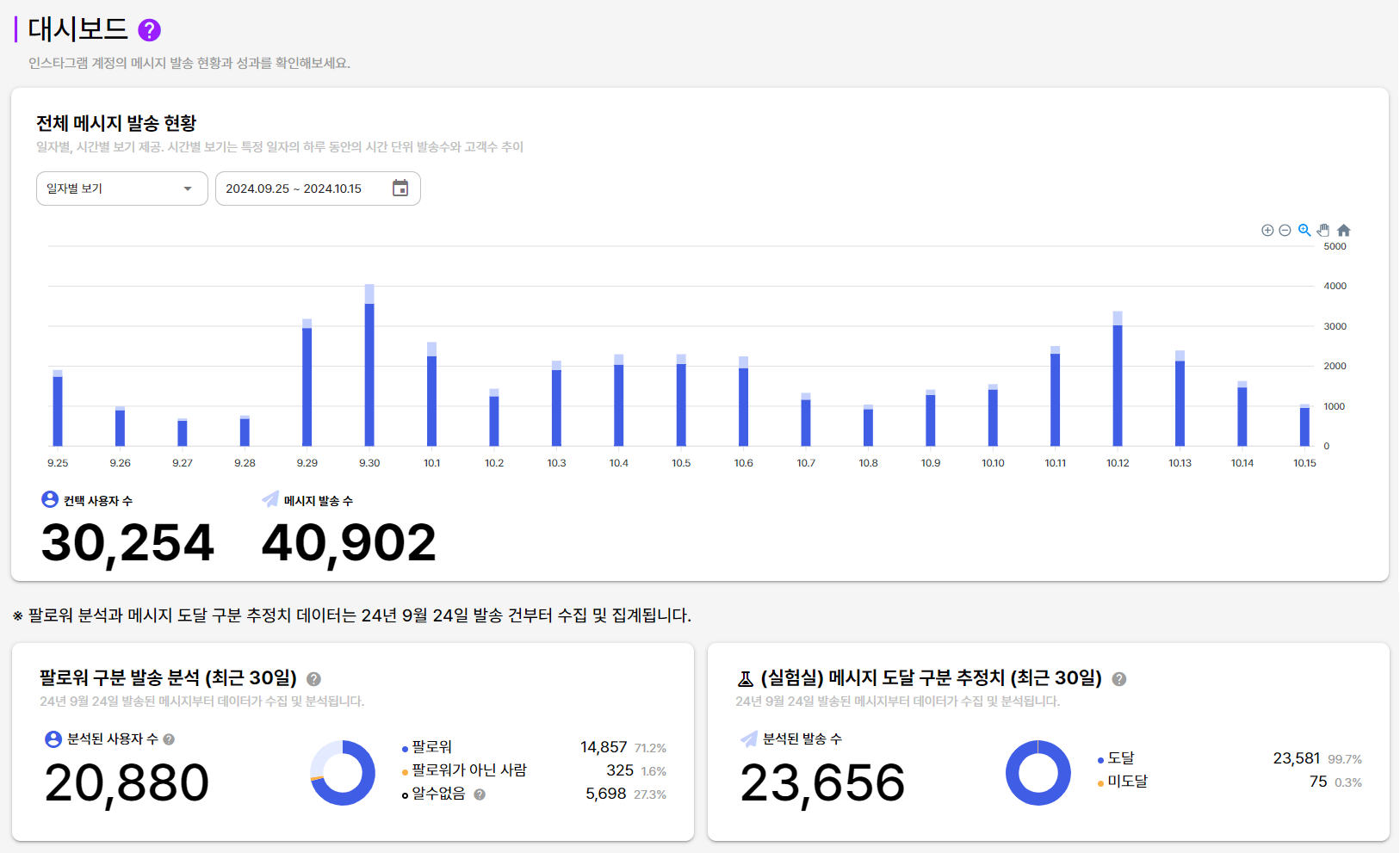 * 발송 현황은 [대시보드](https://socialbiz.gitbook.io/socialbiz/userguide/dashboard) 화면을 통해서 시간/일 단위 그래프와 함께 팔로워/논팔로워에 대한 데이터를 확인할 수 있습니다.