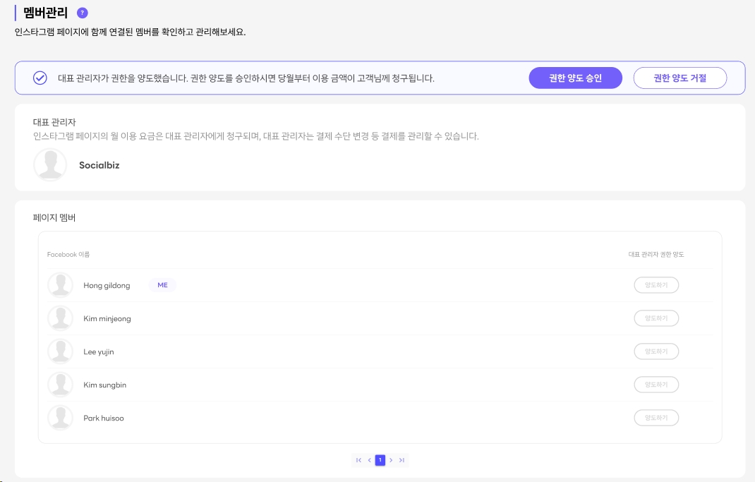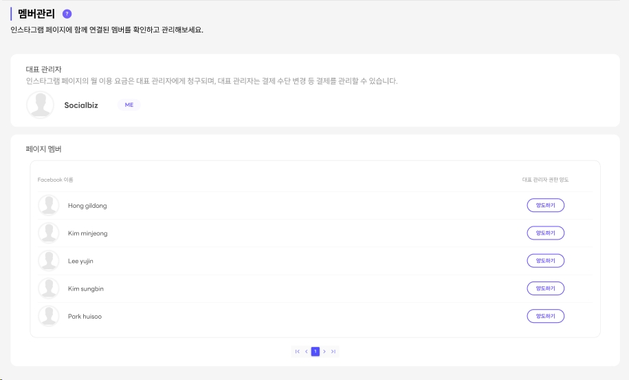 인스타그램 페이지를 소셜비즈와 최초로 연결한 사람은 대표 관리자가 되며, 대표 관리자 권한은 언제든 다른 멤버에게 양도할 수 있어요.