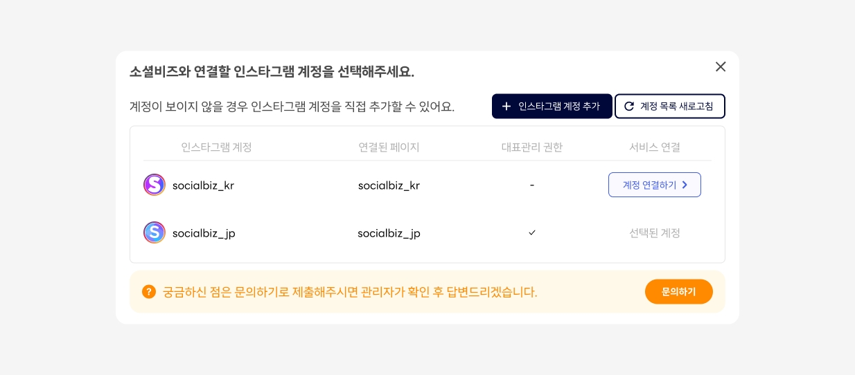 接続可能なアカウントがない場合は、Instagramログインを通じてソーシャルビズを連携してください。