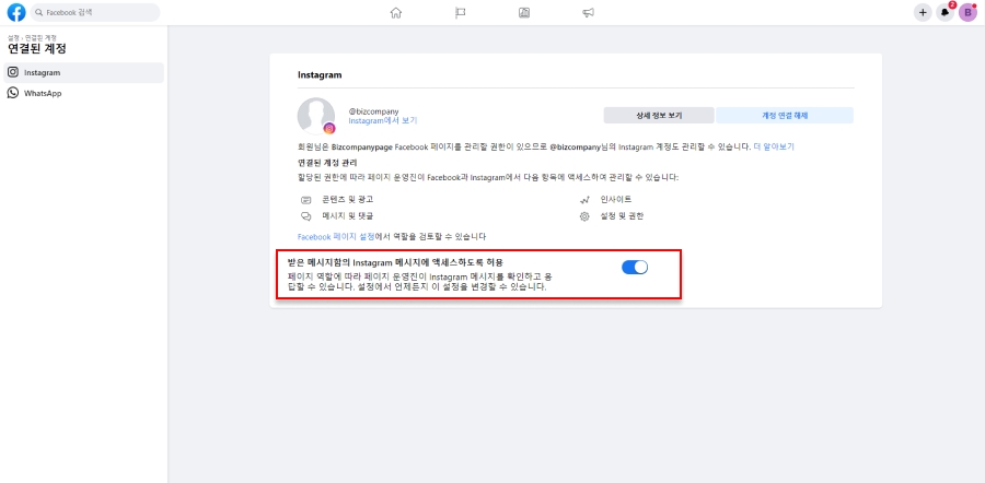 インスタグラムアカウントのメッセージアクセスが許可されていない場合は、アクセスを「許可」に変更してください。